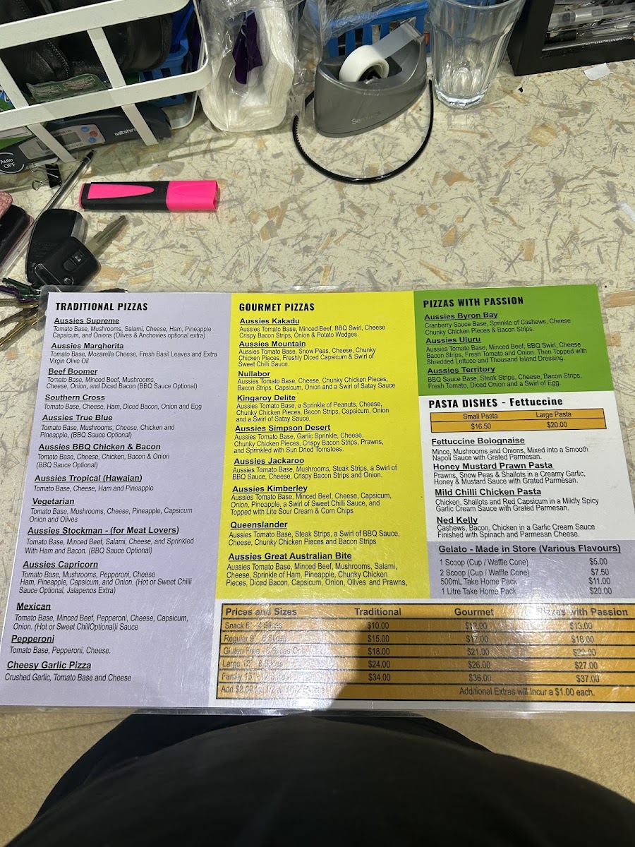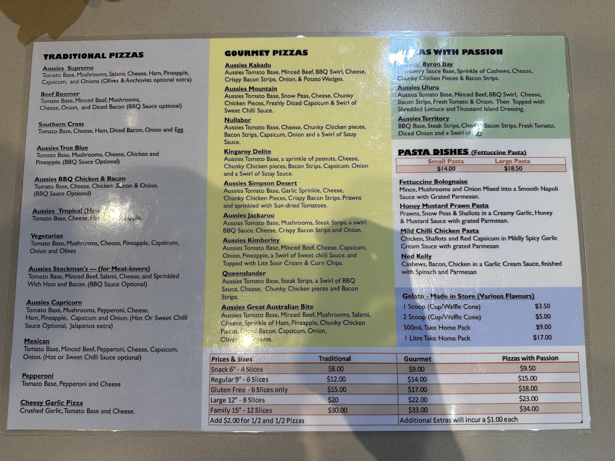 Pizza lovers will find themselves spoilt for choice with a range of pizzas under different categories. The Traditional Pizzas include crowd-pleasers such as the Aussies Supreme, Aussies Margherita, Beef Boomer, Southern Cross, and the Aussies True Blue. For those seeking a more refined flavor profile, the Gourmet Pizzas like Aussies Kakadu, Aussies Mountain, Nullabor, Kingaroy Delite, and Aussies Simpson Desert are sure to satisfy. Meanwhile, the Pizzas with Passion section brings unique creations such as the Aussies Byron Bay, Aussies Uluru, and Aussies Territory, designed to excite your taste buds with every bite.
